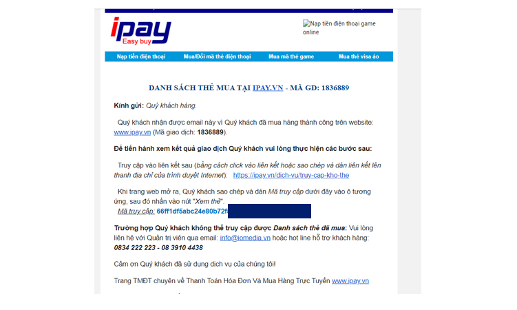Sau khi thực hiện thanh toán ở bước 3, tài khoản của Quý khách đã bị trừ tiền và màn hình hiển thị giao dịch thành công. iPay gửi thông tin hướng dẫn nhận thẻ vào email của Quý khách như hình bên dưới.