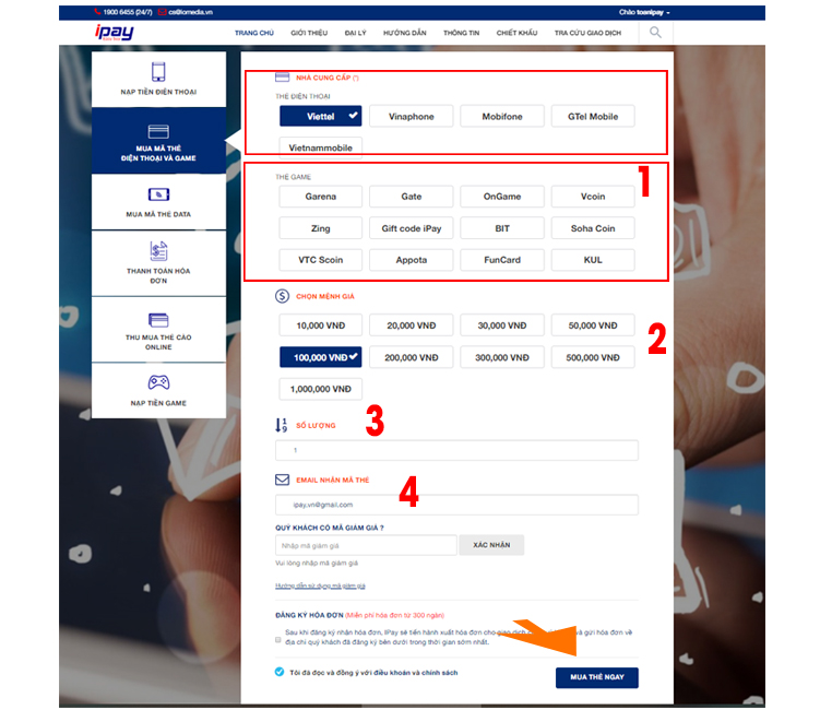 - 4. Nhập email để nhận mã thẻ (bắt buộc phải nhập email để iPay gửi thông tin hướng dẫn nhận thẻ qua email cho quý khách).