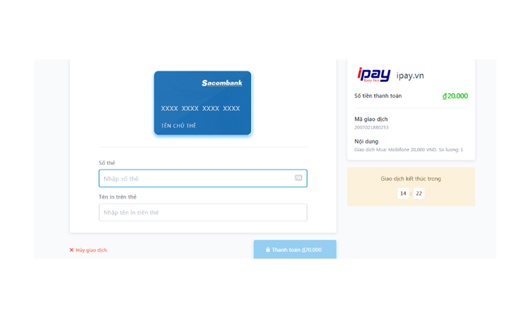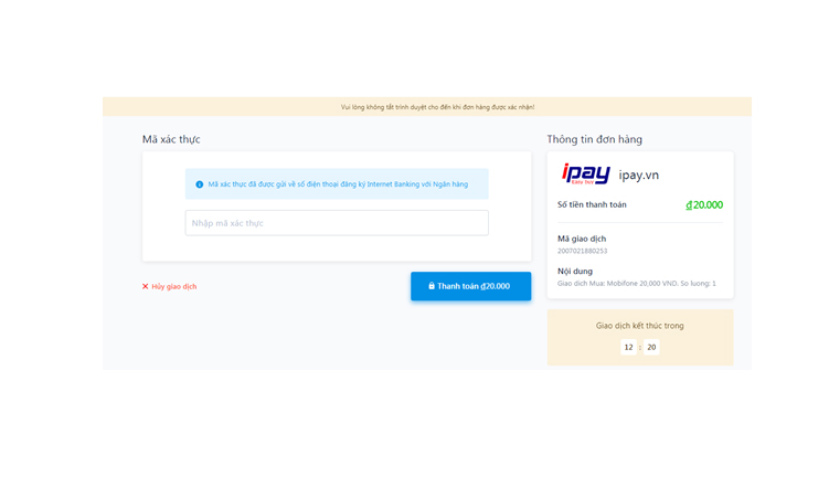 Sau khi nhập thông tin số thẻ và tên in trên thẻ chọn thanh toán, hệ thống sẽ yêu cầu Quý khách nhập mã xác thực gửi về số điện thoại đăng ký tại ngân hàng.