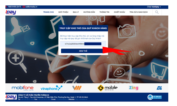 Quý khách truy cập link https://ipay.vn/dich-vu/truy-cap-kho-the, và copy mã truy cập (không sao chép khoảng trắng) trong email và past vào ô như trong hình bên dưới và chọn XEM THẺ
