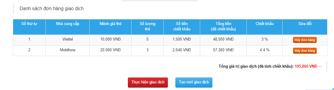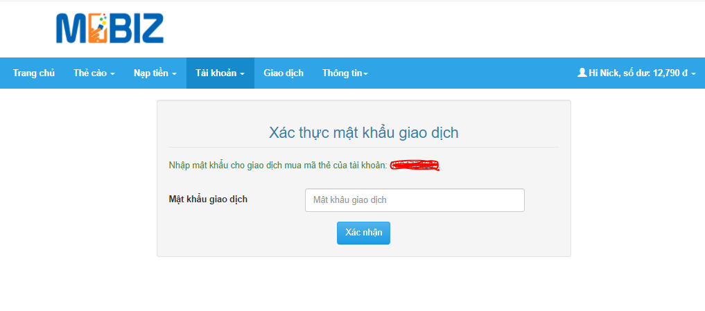 Bước 3: Kiểm tra đơn hàng, chọn Thực hiện giao dịch và nhập mật khẩu giao dịch để hoàn tất các bước mua thẻ cào.
