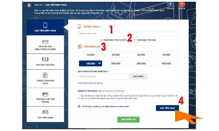 Để nạp tiền điện thoại tại website https://ipay.vn, quý khách vui lòng thực hiện theo 4 bước sau: