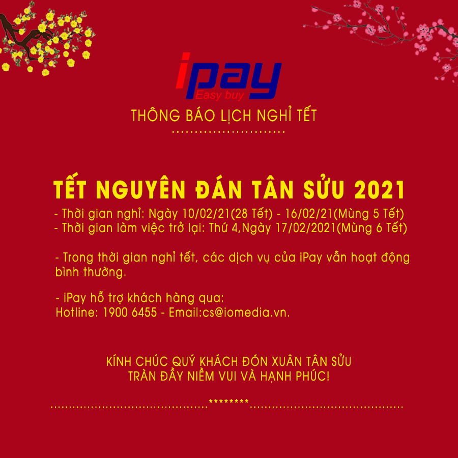 Một lần nữa, iPay xin cảm ơn đến Quý khách hàng đã tin tưởng sử dụng các dịch vụ của iPay trong thời gian qua. iPay kính chúc Quý khách hàng cùng gia đình đón xuân Tân Sửu tràn đầy niềm vui và hạnh phúc!
